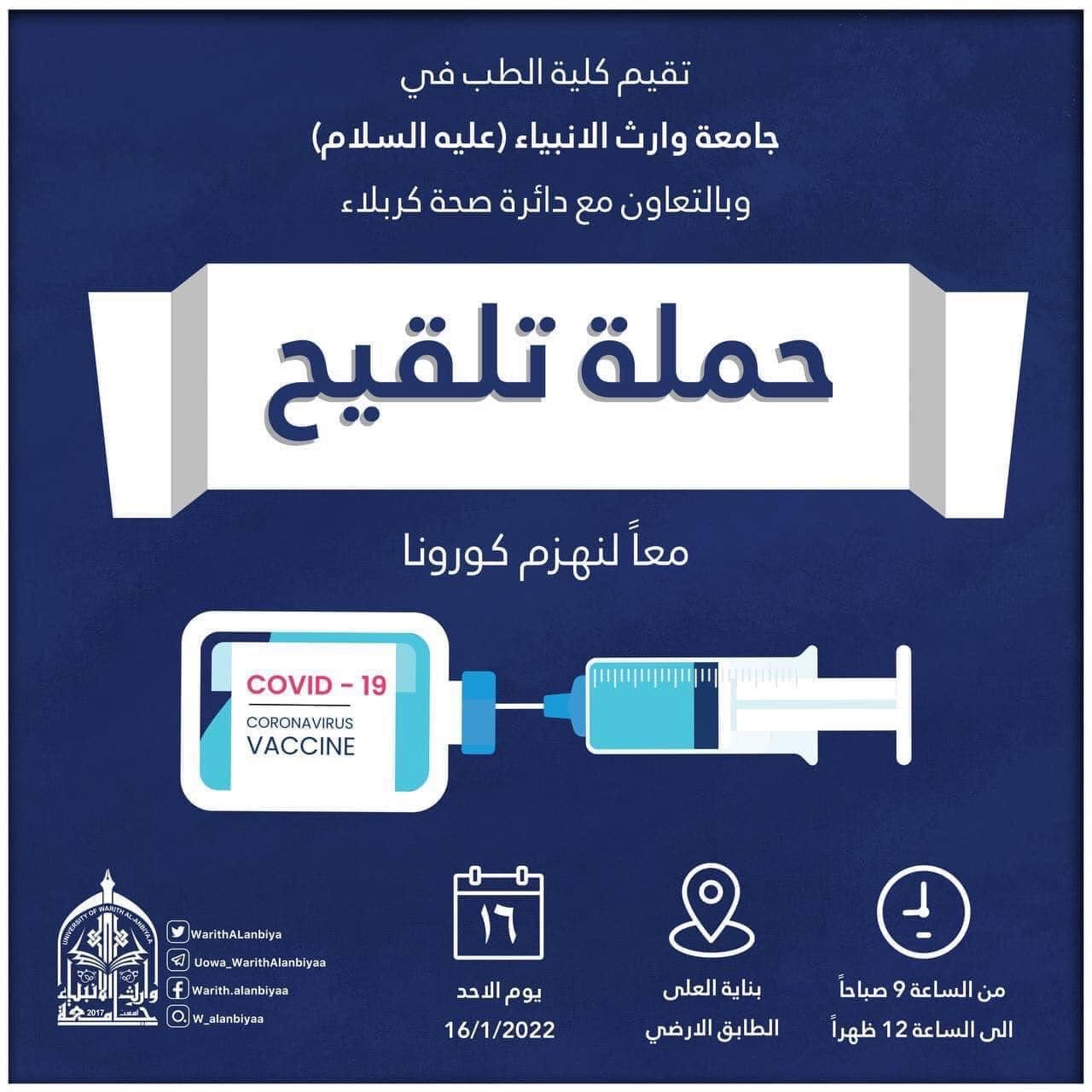 تستمر حملة التلقيح التي تقيمها كلية الطب وبالتعاون مع دائرة صحة كربلاء المقدسة ليوم غد الاحد المصادف 6/2/2022، للحد من إنتشار فايروس كوروناسائلين الله (عزوجل) ان يرزقنا وإياكم دوام الصحة والعافية