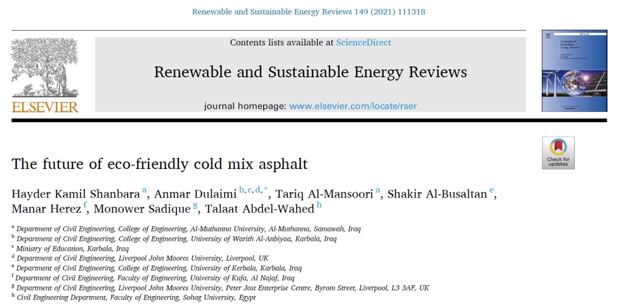 نشر الباحث والأكاديمي في كلية الهندسة الاستاذ المساعد الدكتور انمار فالح ديكان بحثاً علمياً مشتركاً في واحدة من أفضل المجلات العالمية الخاصة بنشر البحوث الهندسية وهذه المجلة تصدر عن دار نشر السفير (Elsevier) ومن الصنف الأول (Q1) ولها معامل تأثير (Impact Factor: 12.11) وسايت سكور (CiteScore: 30.5) ومصنفة ضمن مستوعبات سكوباس وكلاريفيت.وعن موضوع البحث تحدث الاستاذ المساعد الدكتور انمار ديكان قائلاً :هذا البحث تم بمشاركة مجموعة من الباحثين العراقين والعرب والأجانب وجامعة المثنى وجامعة كربلاء وجامعة الكوفة وجامعة سوهاج (مصر) مع جامعة ليفربول جون مورس (بريطانيا).اذ تضمن البحث مراجعة مستقبل الخلطات الاسفلتية الباردة التي تعتبر منتجات واعدة من الناحيتين الاقتصادية والبيئية، حيث تسمح هذه التقنية بصناعة الخلطات الاسفلتية في درجات الحرارة الاعتيادية دون الحاجة الى تسخين كميات كبيرة من الركام والبيتومين ، مما يقلل من انبعاثات ثاني أكسيد الكربون ويوفر الطاقة ، تهدف هذه الدراسة إلى مراجعة أنواع الخلطات الاسفلتية الباردة والتقنيات المعتمدة لاستخدامها دون انخفاض الأداء أثناء الخدمة. وتهدف أيضاً إلى تقديم مرجع عملي لتصنيع مستحلب البيتومين وإجراءات تصميم الخلطات. هذا البحث سيكون مرجعاً مهماً لكل الباحثين المهتمين بالطرق وخصوصاً المهتمين باستخدام الخلطات الاسفلتية الباردة.