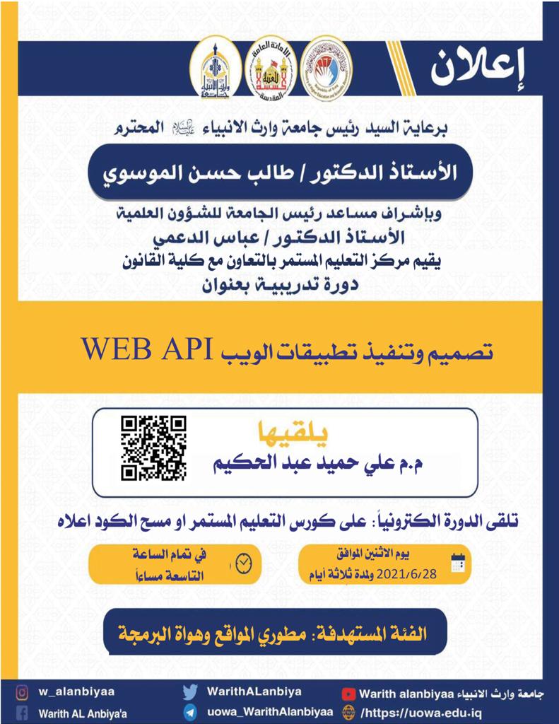 ضمن البرامج التدريبية التي تقيمها جامعة وارث الانبياء (عليه السلام)، يقيم مركز التعليم المستمر دورة تدريبية للمبرمجين والهواة في تصميم المواقع تحت عنوان: (تصميم وتنفيذ تطبيقات الويب Web API) يلقيها التدريسي في كلية القانون :م.م علي حميد / كلية القانون ماجستير- علوم حاسباتوذلك ابتداء من يوم الاثنين الموافق 28/6/2021 ولمدة ثلاث ايامفي تمام الساعة التاسعة مساءا وتلقى الدورة الكترونيا على منصة التعليم الالكتروني التابعة للجامعة -ضمن كورس التعليم المستمر اًو من خلال الضغط على التالي: