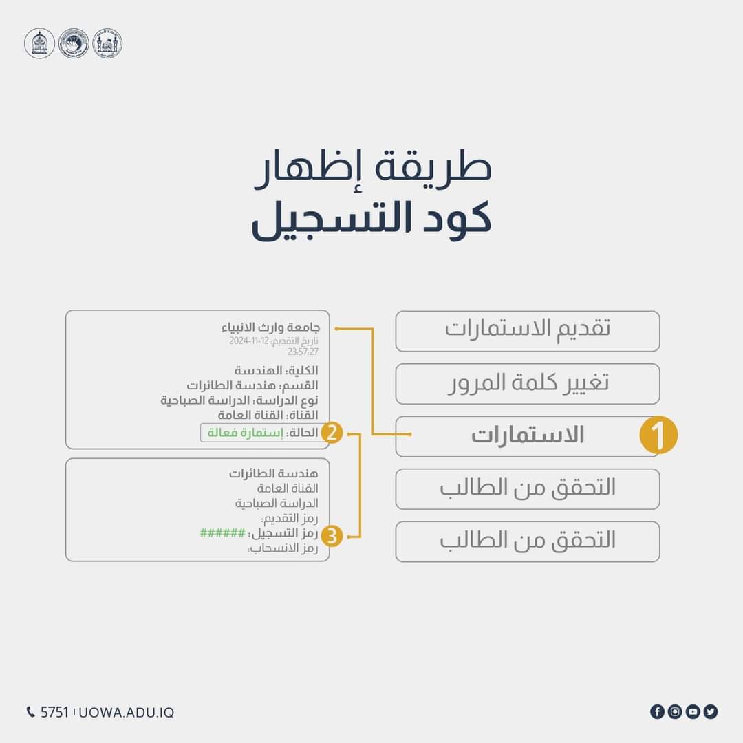 أعلن قسم التسجيل في جامعة وارث الأنبياء (عليه السلام) عن دعوة جميع الطلبة لمراجعة أقسام الكليات كلٌ حسب تخصصه، لاستلام الحسابات وكلمات المرور الخاصة بهم. كما أكدت الجامعة على أهمية متابعة تطبيق الجامعة والالتزام بالتعليمات المتعلقة بالصور والمعلومات الأخرى المطلوبة.