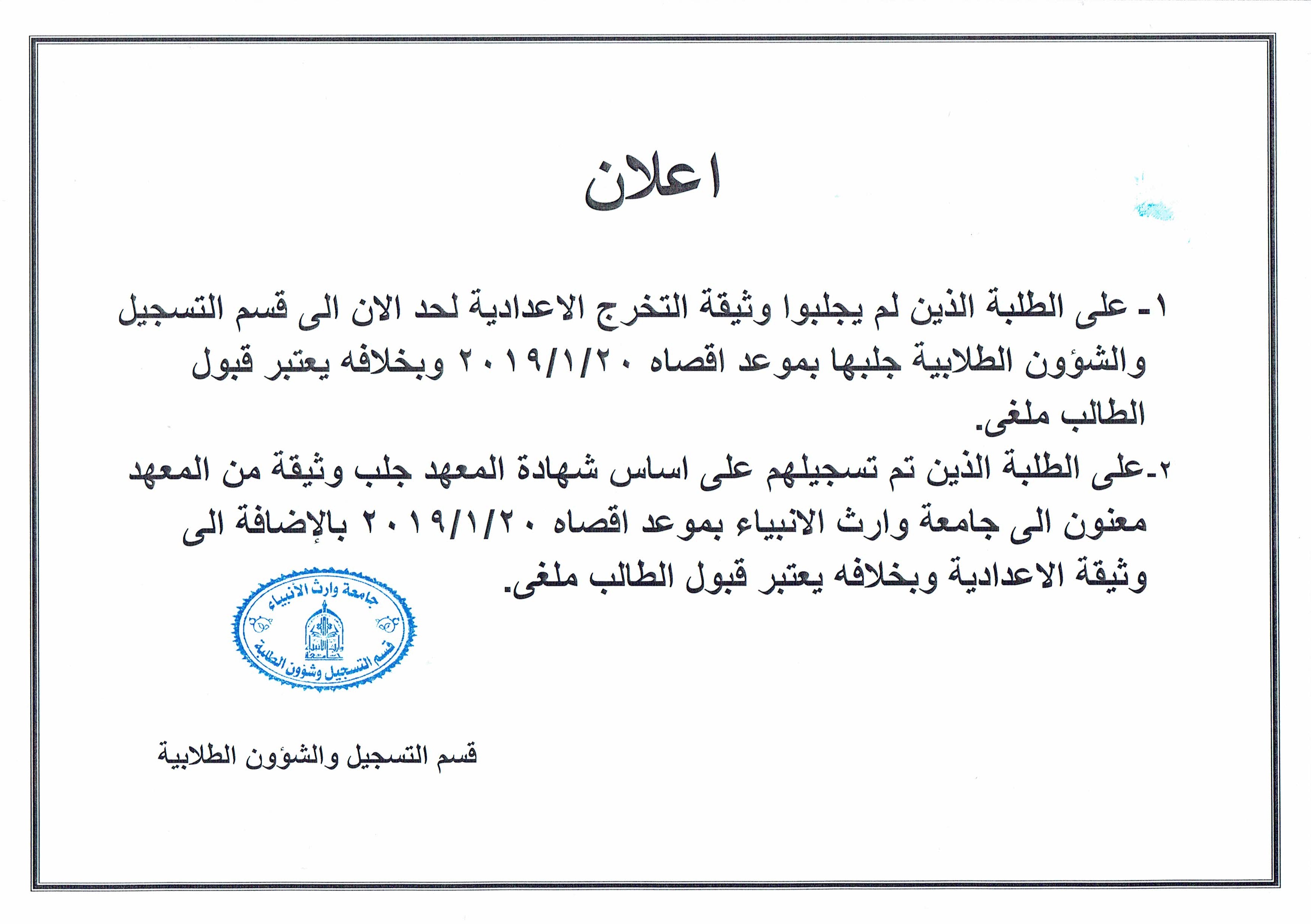 2- على الطلبة الذين تم تسجيلهم على اساس شهادة المعهد جلب وثيقة من المعهد معنون الى جامعة وارث الانبياء بموعد اقصاه 20/1/2019 بالإضافة الى وثيقة الاعدادية وبخلافه يعتبر قبول الطالب ملغى.