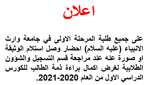 على جميع طلبة المرحلة الأولى تزويد قسم التسجيل والشؤون الطلابية بوثيقة الإعدادية الاصلية بأقرب وقت ممكن وبخلافه يتم الغاء قبوله.