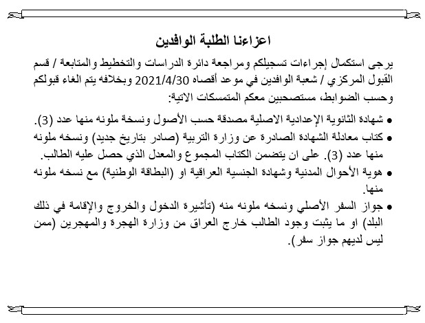 اخر موعد لتسليم الوثائق يوم 15/10/2021 على الطلبة احضار الوثيقة الاصلية للدراسة الاعدادية باسرع وقت ممكن وبخلافة يتم ترقين قيد الطالب حسب الاوامر الوزارية.