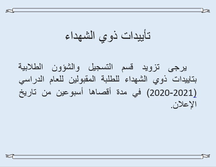 يرجى من ذوات المدرجة اسمائهم ادناه تزويد قسم التسجيل والشؤون الطلابية بتتأيد ذوي الشهداء خلال فترة اسبوع وبخلافه يتم الغاء قبول الطالب حسب تعليمات الوزارية.
