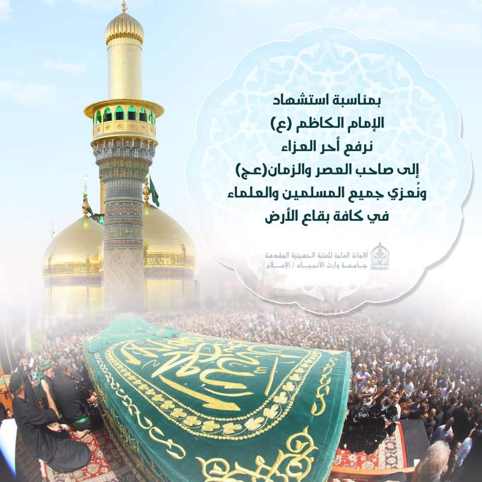 بسم الله الرحمن الرحيمبمناسبة حلول الذكرى المدمية للقلوب ذكرى استشهاد سيدنا ومولانا الامام موسى بن جعفر الكاظم (عليه السلام) في قعر سجون الظالمين والبغاة ، لا يسع جامعة جده الامام الحسين (عليه السلام) جامعة وارث الانبياء (عليه السلام) إلا ان تعلن حدادها وترفع رايتها السوداء بهذه المناسبة الاليمة وتقرر اعلان يوم الثلاثاء المصادف 25/رجب الاصب/1440 الموافق 2019/4/2 عطلة رسمية للجامعة .عظم الله تعالى أجورنا وأجوركم وإنا لله وإنا اليه راجعون .