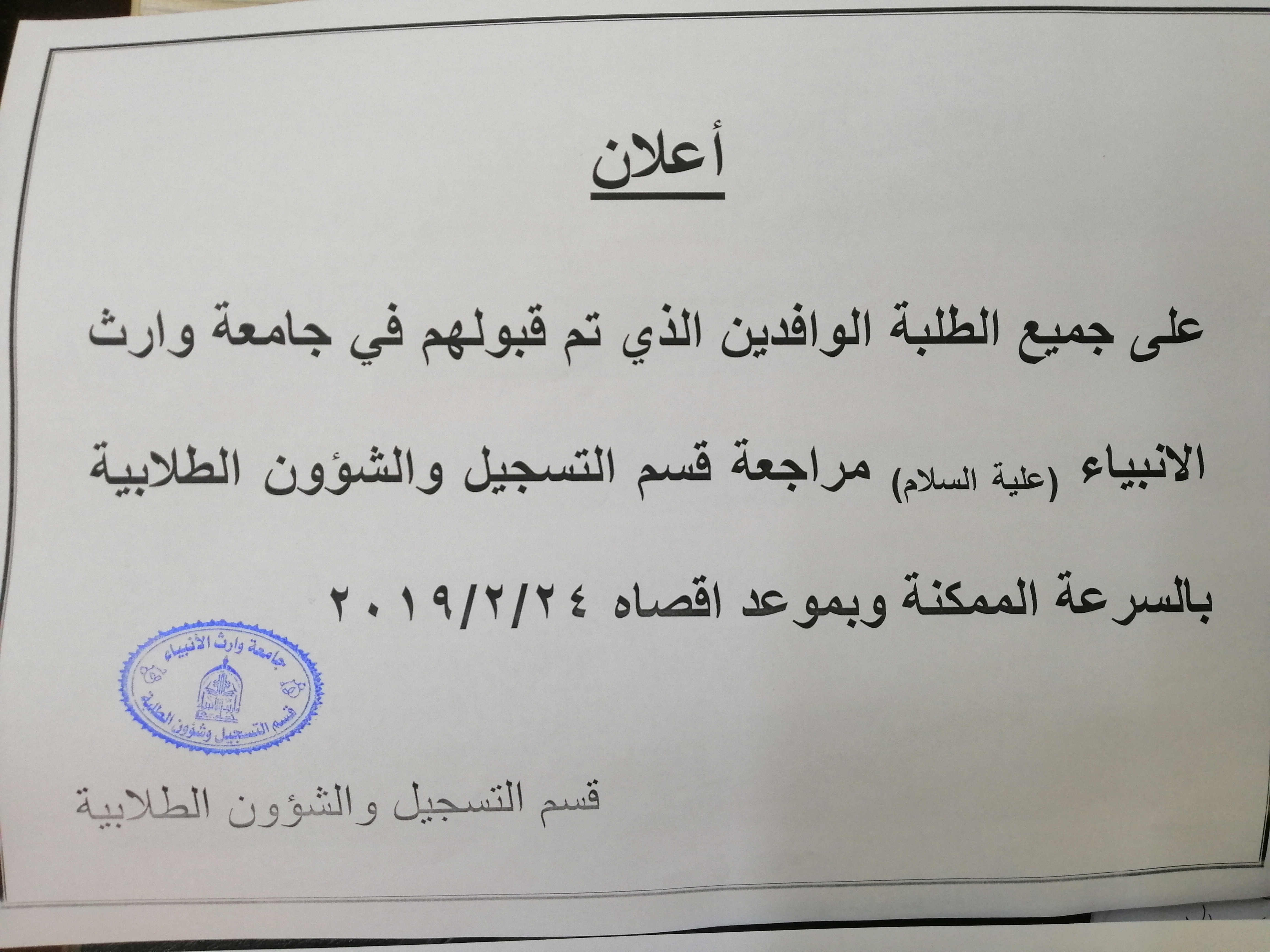 على الطلبة الوافدين الى جامعة وارث الانبياء للعام الدراسي ٢٠١٩/٢٠١٨ مراجعة قسم التسجيل بالسرعه الممكنه بموعد اقصاه ٢٠١٩/٢/٢٤ وحسب الكتاب المبين اعلاه.