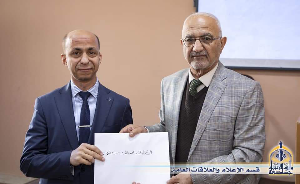 وجه الاستاذ الدكتور طالب حسن موسى /رئيس جامعة وارث الانبياء كتاب شكر وتقدير الى الأستاذ المساعد الدكتور خميس بندر عبيد السعيدي /عميد كلية التمريض/جامعة وارث الانبياء وذلك لنشرة بحثين علميين في مجلة عالمية ويعد هذا العمل حلقة انجاز تضاف الى انجازات الكلية والجامعة على الصعيد العالمي في نشر البحوث.