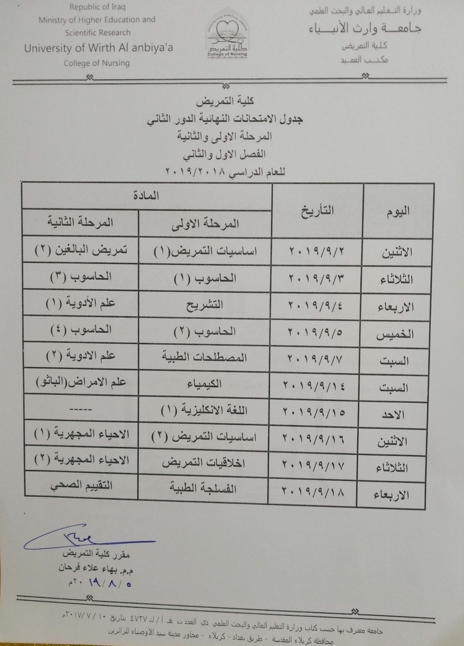 جدول الامتحانات النهائية الدور الثاني / المرحلة الاولى والثانية /العام الدراسي ٢٠١٩/٢٠١٨