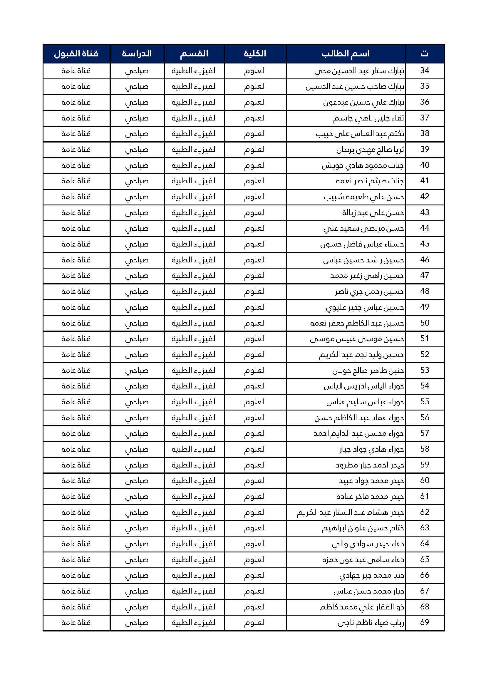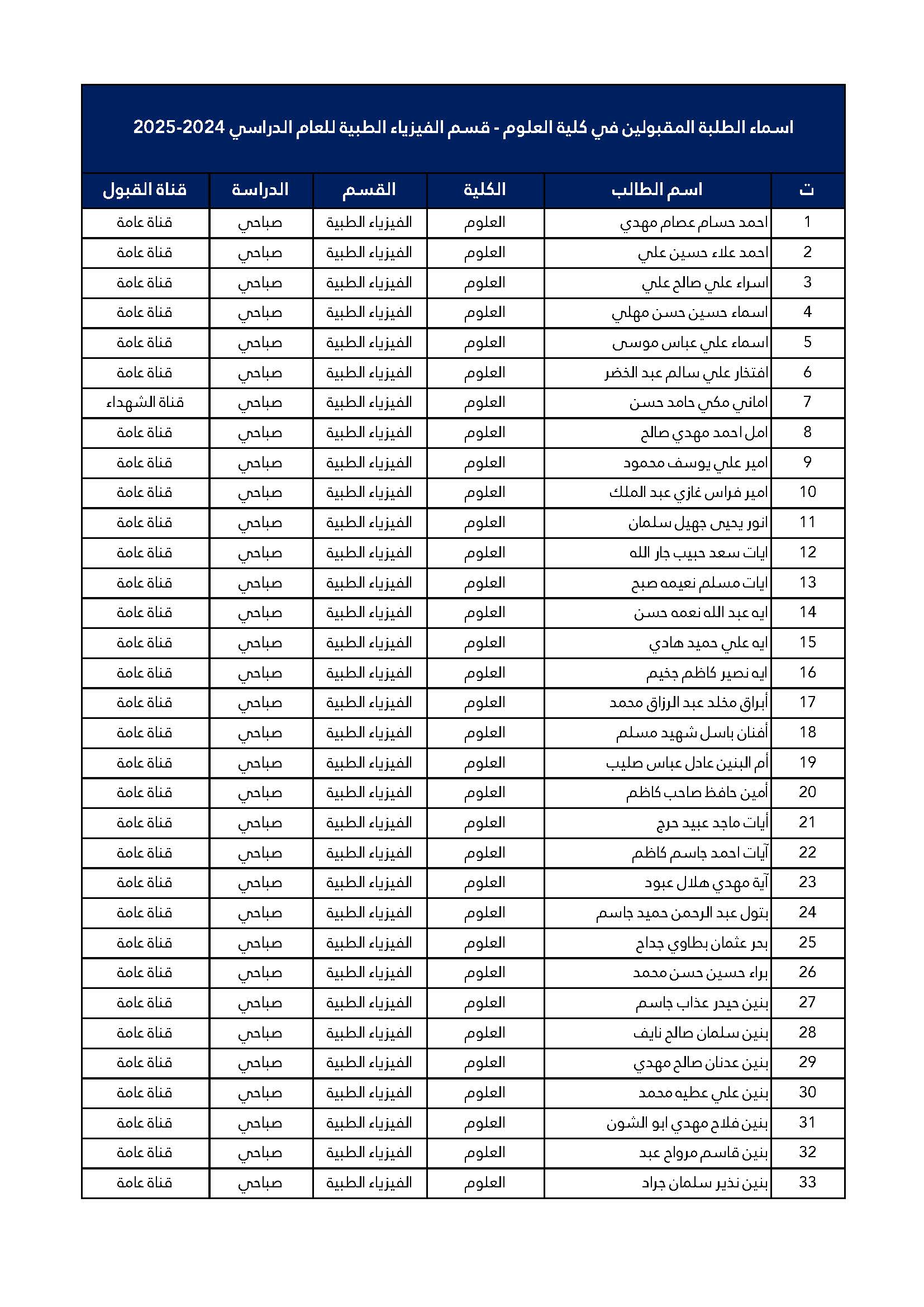 اسماء الطلبة المقبولين للدراسة الصباحية للمرحلة الاولى كلية العلوم قسم الفيزياء الطبية