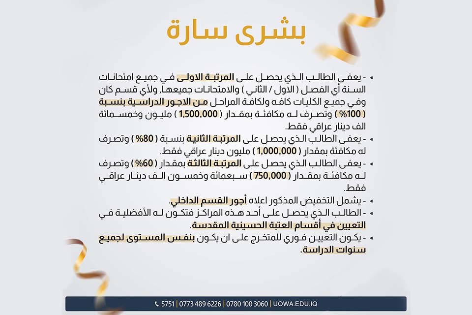 المرتبة الأولى: يُعفى الطالب الذي يحصل على المرتبة الأولى في جميع امتحانات السنة (الفصل الأول والثاني) بنسبة 100% من الأجور الدراسية، بالإضافة إلى منحه مكافأة مالية مقدارها (1,500,000) مليون وخمسمائة ألف دينار عراقي.