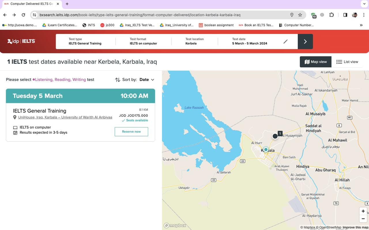 صورة الخارطة توضح موقع جامعة وارث الأنبياء في العراق كمركز معتمد لامتحان (IELTS)