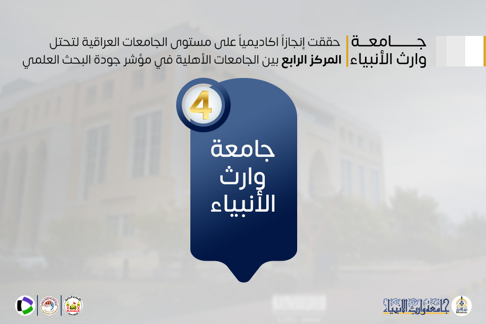 حققت جامعة وارث الأنبياء (عليه السلام) إنجازاً أكاديمياً جديداً في مجال البحث العلمي، بحصولها على المرتبة الرابعة بين الجامعات الأهلية، والمرتبة الثانية عشرة بين الجامعات العراقية الحكومية والأهلية مجتمعة، وذلك وفقاً لمؤشر جودة البحث العلمي الصادر عن وزارة التعليم العالي والبحث العلمي، والذي استند إلى بيانات البحوث المنشورة في مستوعب Web of Science للفترة من 2020 إلى 2024.