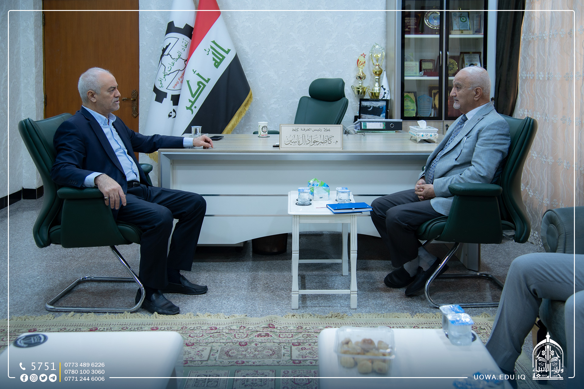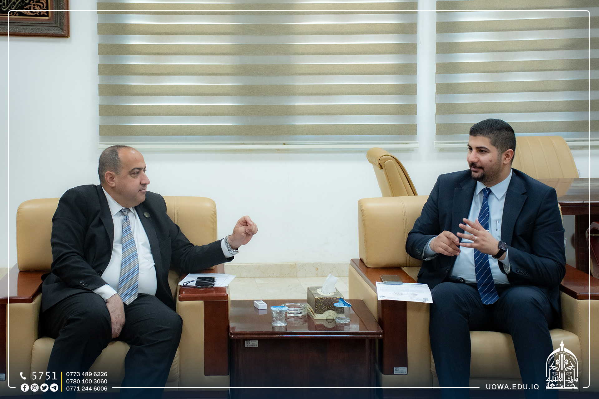 رئيس جامعة وارث الأنبياء (عليه السلام) الأستاذ الدكتور إبراهيم الحياوي يستقبل رئيس قسم الإعلام في العتبة الحسينية المقدسة المهندس عباس الخفاجي، وذلك لتعزيز التعاون بين قسم الاعلام في العتبة الحسينية المقدسة ورئاسة الجامعة.