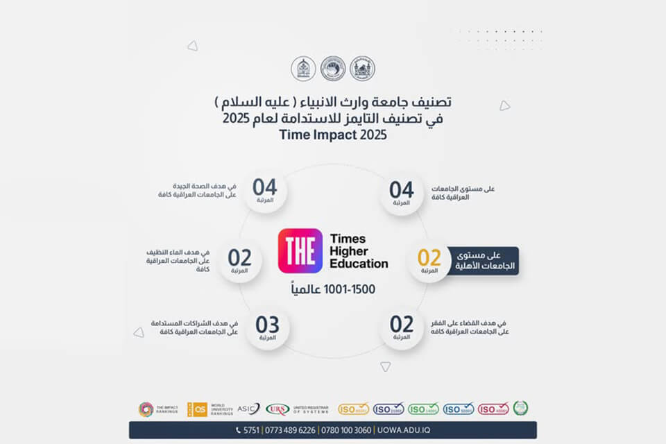 سجّلت جامعة وارث الأنبياء (عليه السلام) تقدماً ملحوظاً ضمن نتائج تصنيف التايمز العالمي لعام 2025 (Times Higher Education Impact Rankings)، حيث أحرزت المرتبة الثانية على مستوى الجامعات الأهلية في العراق، مؤكدة بذلك مكانتها الأكاديمية المتقدمة ومواصلة تطورها في مختلف المجالات التعليمية والبحثية.