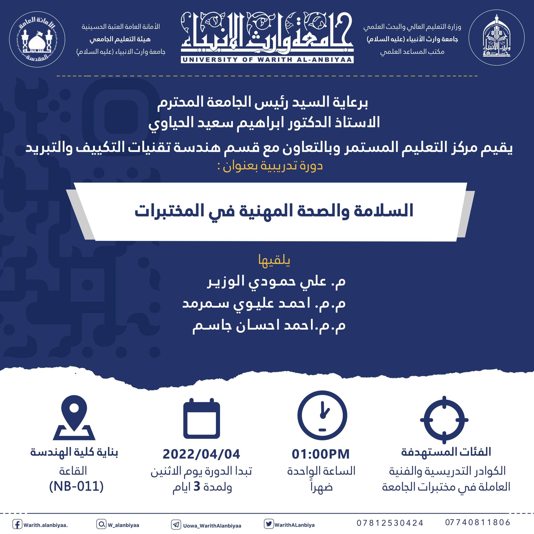برعاية رئيس الجامعة الاستاذ الدكتور ابراهيم الحياوي نظم مركز التعليم المستمر وبالتعاون مع قسم هندسة تقنيات التبريد والتكييف دورة تدريبية بعنوان " السلامة والصحة المهنية في المختبرات "