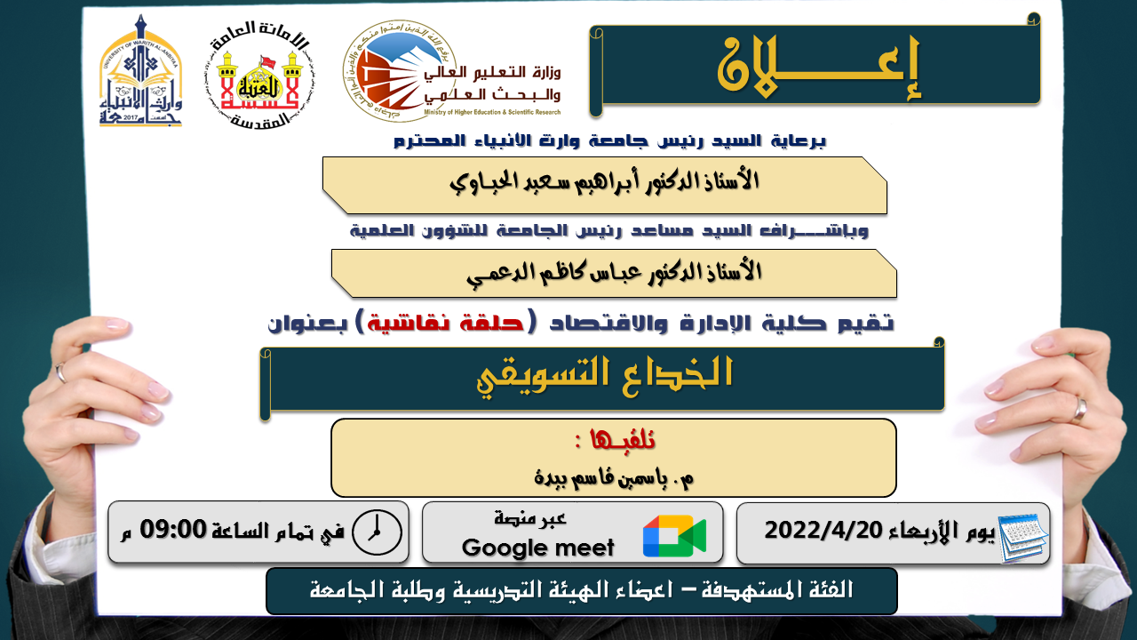 يقيم مركز التعليم المستمر في جامعة وارث الانبياء (عليه السلام) بالتعاون مع كلية الادارة والاقتصاد ندوة علمية بعنوان "الخداع التسويقي"، تلقيها ... م. ياسمين قاسم بيدةيوم الاربعاء الموافق 2022/4/20، في تمام الساعة الـ 9:00 مساءً ، علماً ان الندوة تستهدف الهيئة التدريسية وطلبة كلية الادارة والاقتصاد عبر منصة Google meet