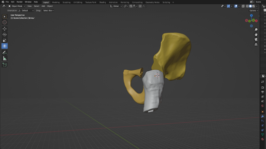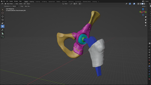 Using Blender, a powerful 3D modelling software, the team designed a custom hip implant tailored to the patient's anatomy. The prosthetic features a specially contoured head that fits the pelvic cavity, along with integrated fixation elements to ensure secure placement. The design strategically addresses load redistribution and prioritizes long-term mechanical stability.