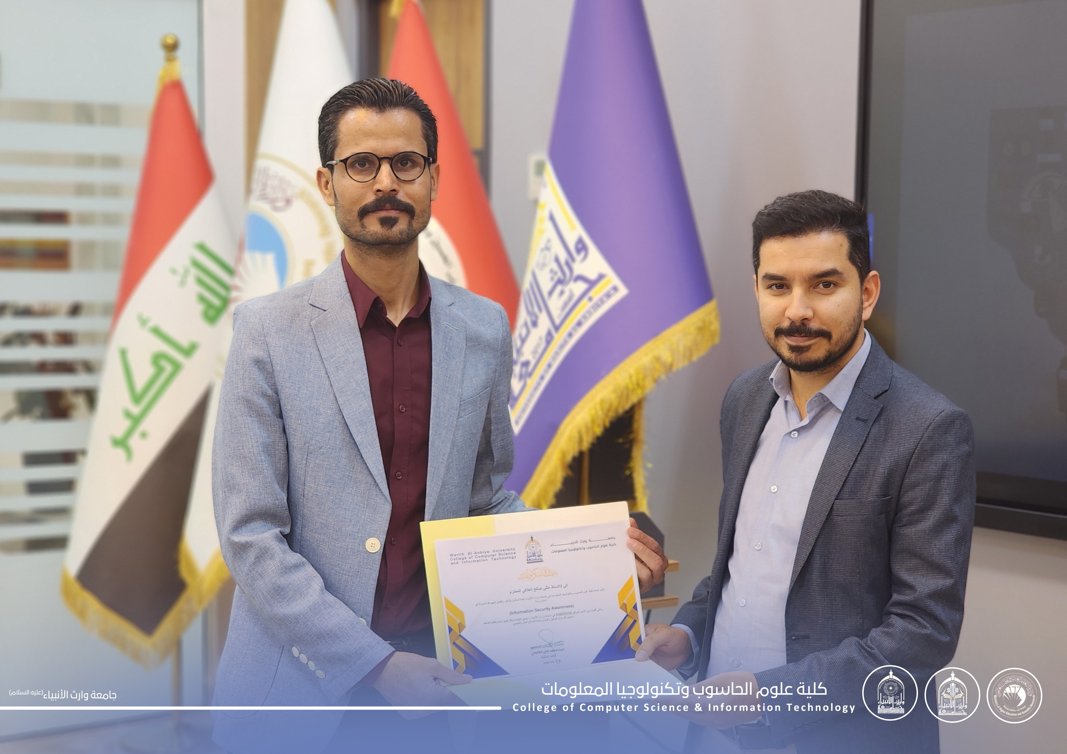 At the conclusion of the workshop, Dr. Ali Kareem Abdul Rahim, Head of the Cybersecurity Department, honored the lecturer in appreciation of his efforts in delivering valuable scientific content that contributes to developing students’ skills and raising their technical awareness.