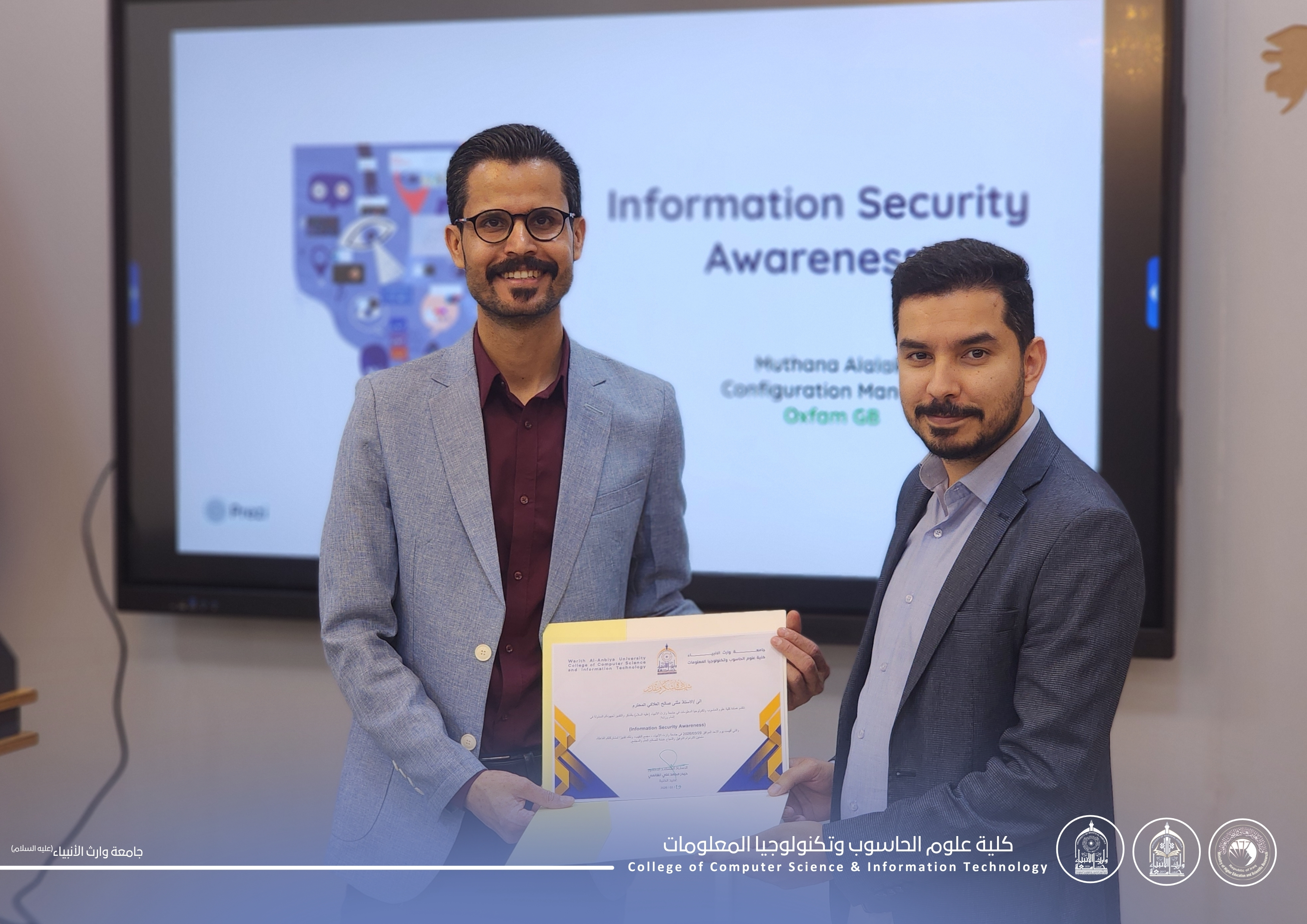 The workshop was delivered by Assistant Lecturer Muthanna Saleh Mahdi Al-Allaqi, who addressed key concepts of cybersecurity, methods of preventing cyber threats, and the importance of adopting best practices to protect personal and institutional information.