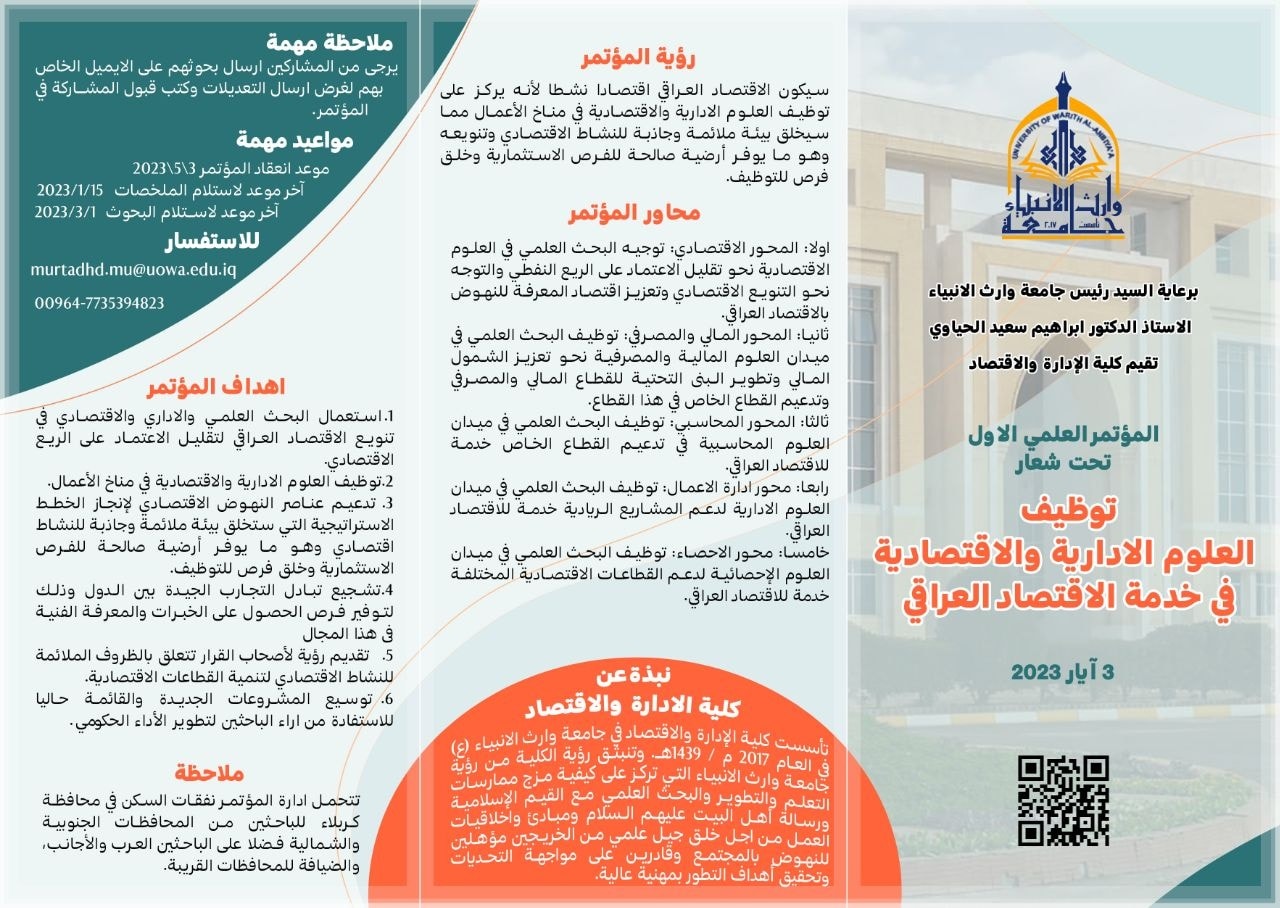 Under the patronage of the university president, Professor Dr. Ibrahim Al-Hayawi, the College of Management and Economics at the University of Warith Al-Anbiyaa (Peace Be Upon Him) organized its first scientific conference. The conference was held under the theme "Utilizing Managerial and Economic Sciences in the Service of the Iraqi Economy.