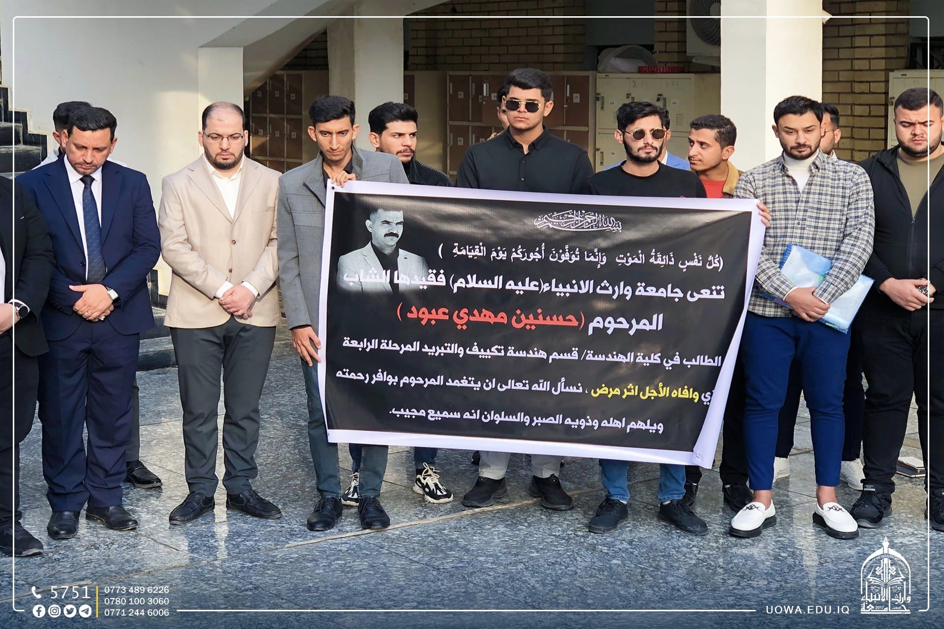 The College of Engineering at the University of Warith Al-Anbiyaa (peace be upon them) witnessed a touching mourning vigil. Faculty and students gathered to commemorate the soul of the virtuous young student, Hassanein Mahdi Aboud, who was studying in the Department of Air Conditioning and Refrigeration Technologies in the fourth stage.