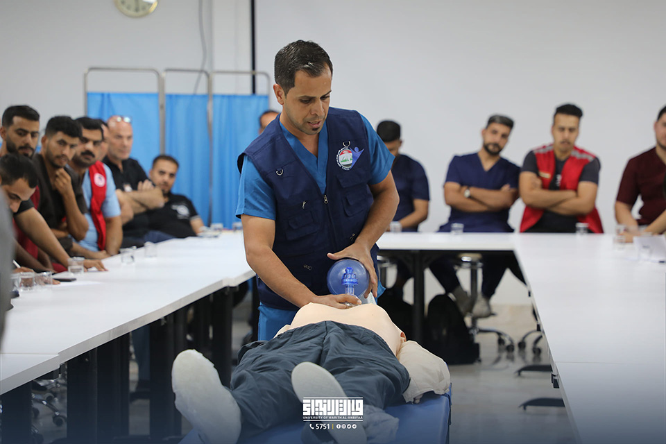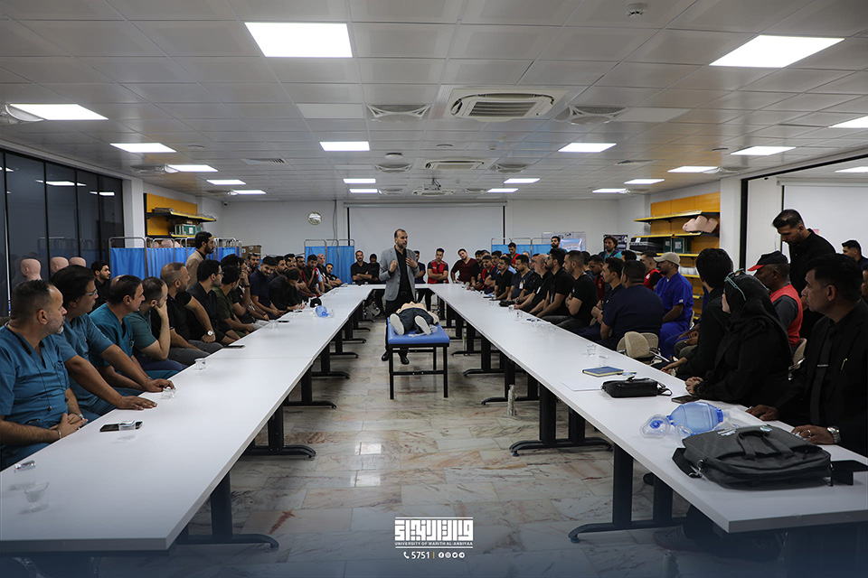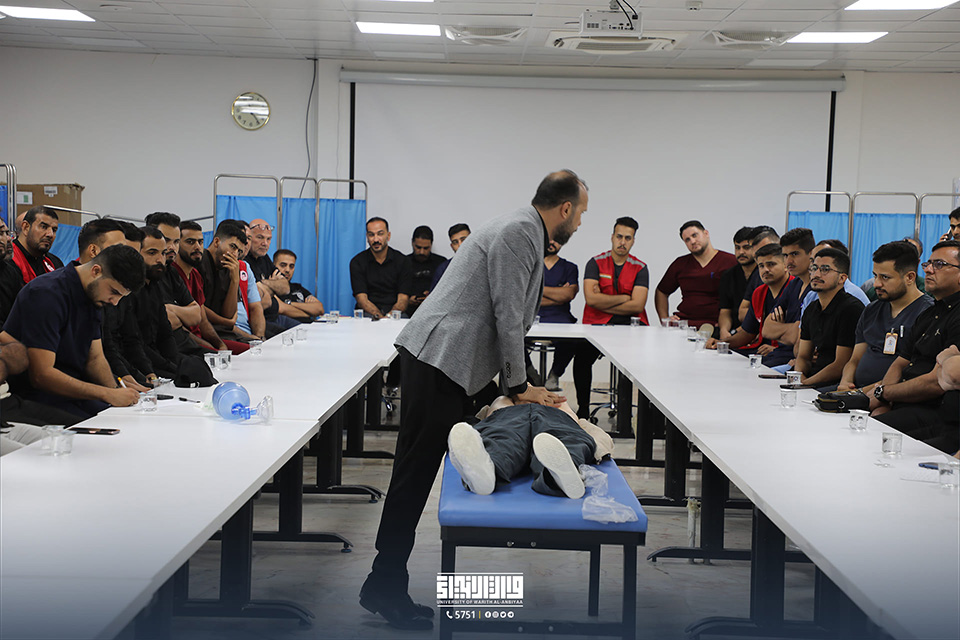 In collaboration with the Regional Centre for Emergency Medicine, the College of Medicine at the University of Warith Al-Anbiyaa (PBUH) arranged a training workshop on advanced first aid (BLS) at the College laboratories. The event was witnessed by the President of the University, Dr. Ibrahim Al-Hayawi, the Dean of the College of Medicine, Dr. Ali Abd Saadoun Al-Ghazi, and the Director of the Centre for Emergency Medicine, Dr. Fadel Okla Al-Rubaie.
