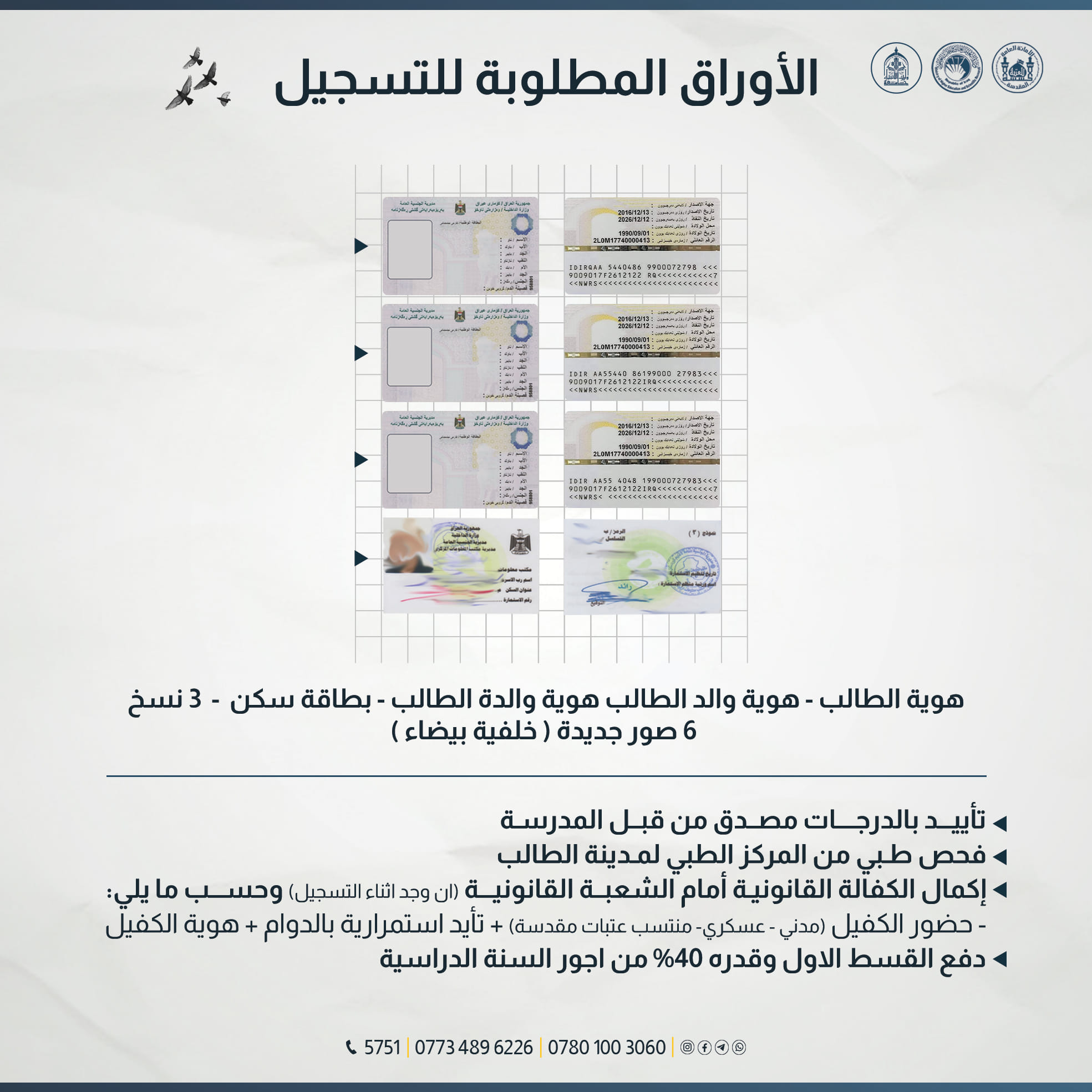 1. Student's account, username, and password.2. Academic transcript or grade confirmation.3. Four documents for the student, father, and mother (national ID or civil status ID, residence card).4. Six passport-sized photos.5. Medical examination if available.6. Sponsorship guarantee with the sponsor's attendance, along with a confirmation of continued employment and work ID.7. Students applying through the Martyrs' Channel must bring confirmation from the Central Martyrs Foundation in Baghdad exclusively.8. Applicants for Social Care Excellence should bring the original social care ID.