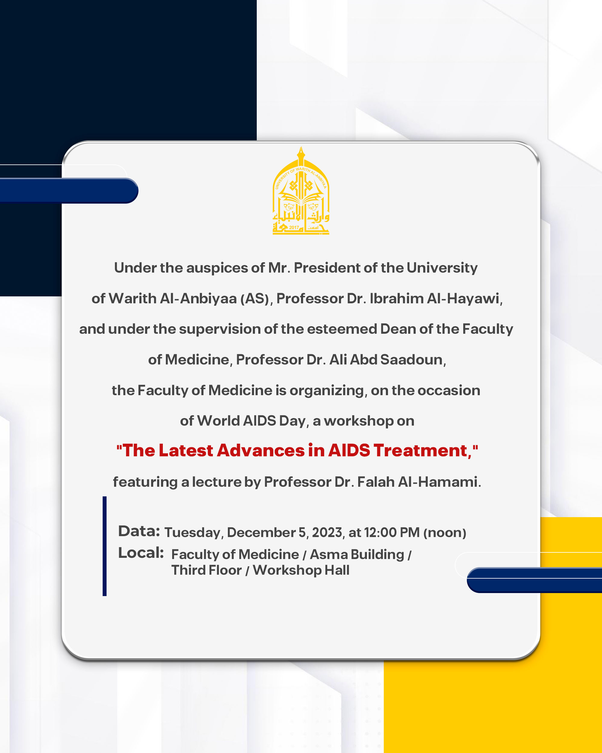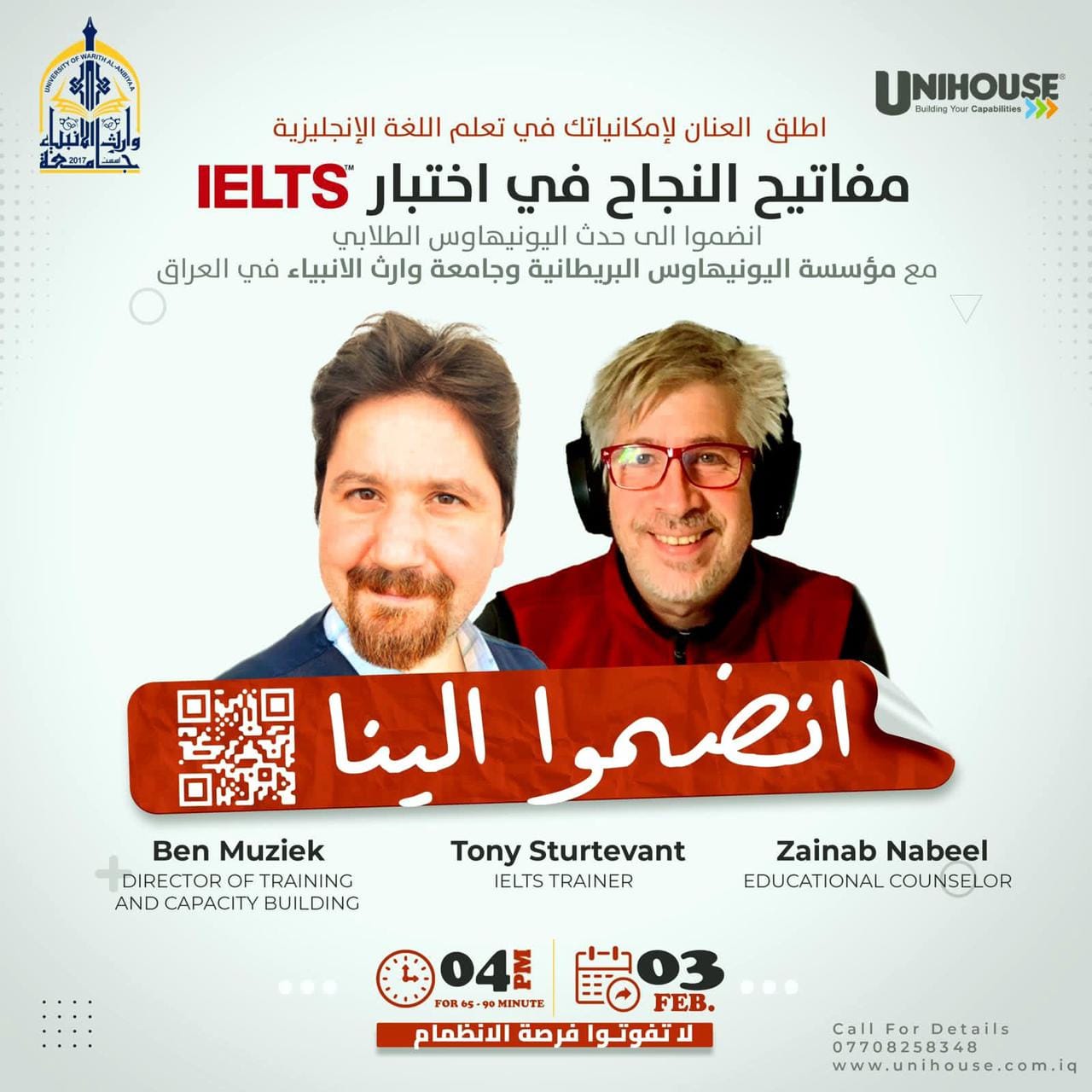 Based on the official directives from the Ministry of Higher Education and Scientific Research regarding the necessity of adopting the British IELTS English language test as a standard for accepting students in postgraduate studies, the University of Prophets' Heritage is organizing an informative online seminar in collaboration with the British institution UniHouse. Mr. Ben Music, the Director of Training and Capacity Building at the institution, along with Mr. Tony Sturtevant, one of their course trainers, will provide answers to common questions such as: - What is the exam? - How is it conducted? - Who are the target candidates for the test? - How will the exam benefit you in the future? - What are the best tips for passing the exam? - How to prepare for the exam? The seminar will also include interactive sections to showcase real examples of the exam and online training courses. To join us, please visit the attached link Saturday, 3/2/2024- 4:00 PM.