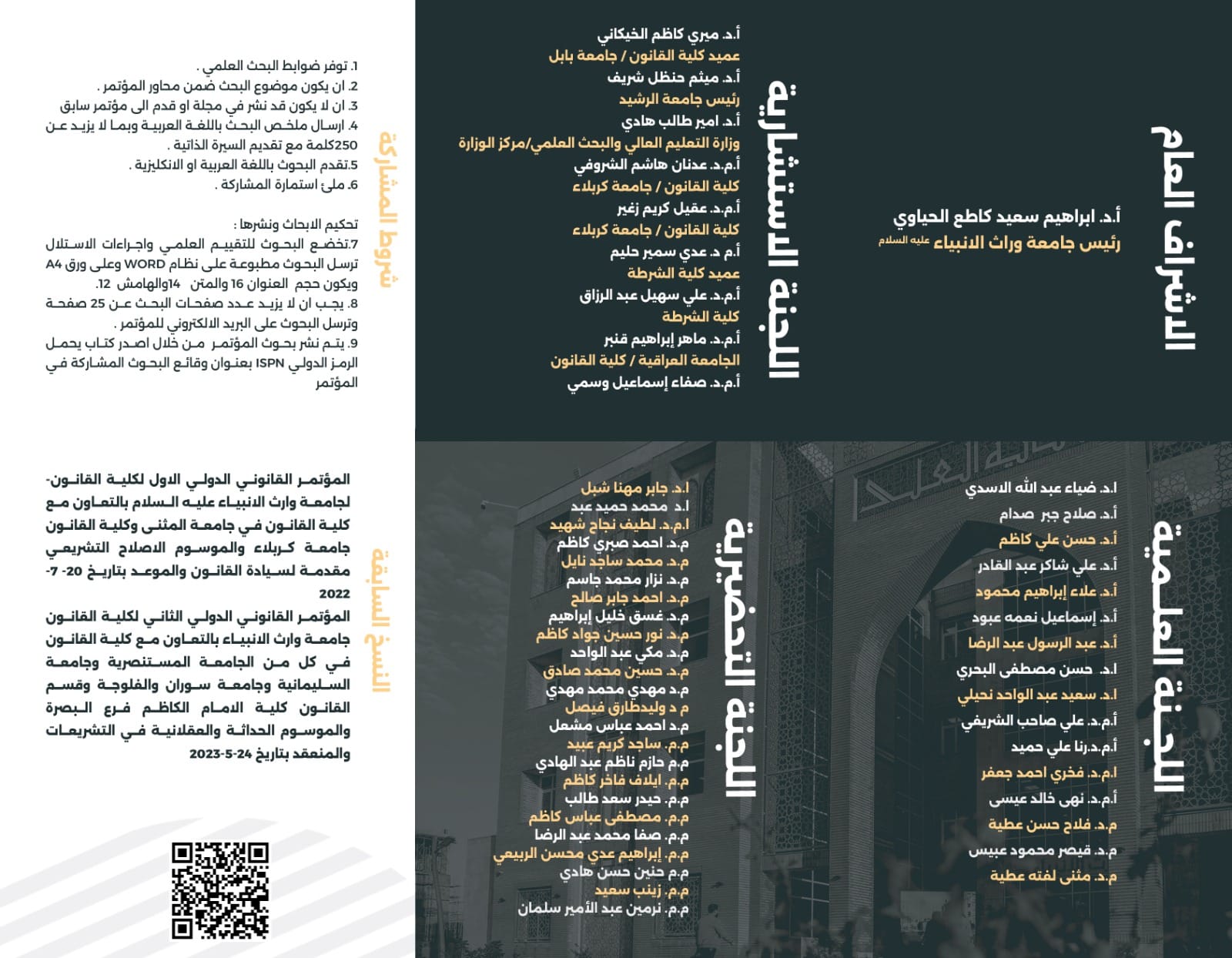 The College of Law at the University of Warith Al-Anbiyaa is pleased to invite researchers and academics to participate in its "Third Law Conference" scheduled under the theme "Social Peace: Means and Challenges". This comes in collaboration with the Colleges of Law at the University of Karbala, University of Babylon, University of Baghdad, and the Police College.