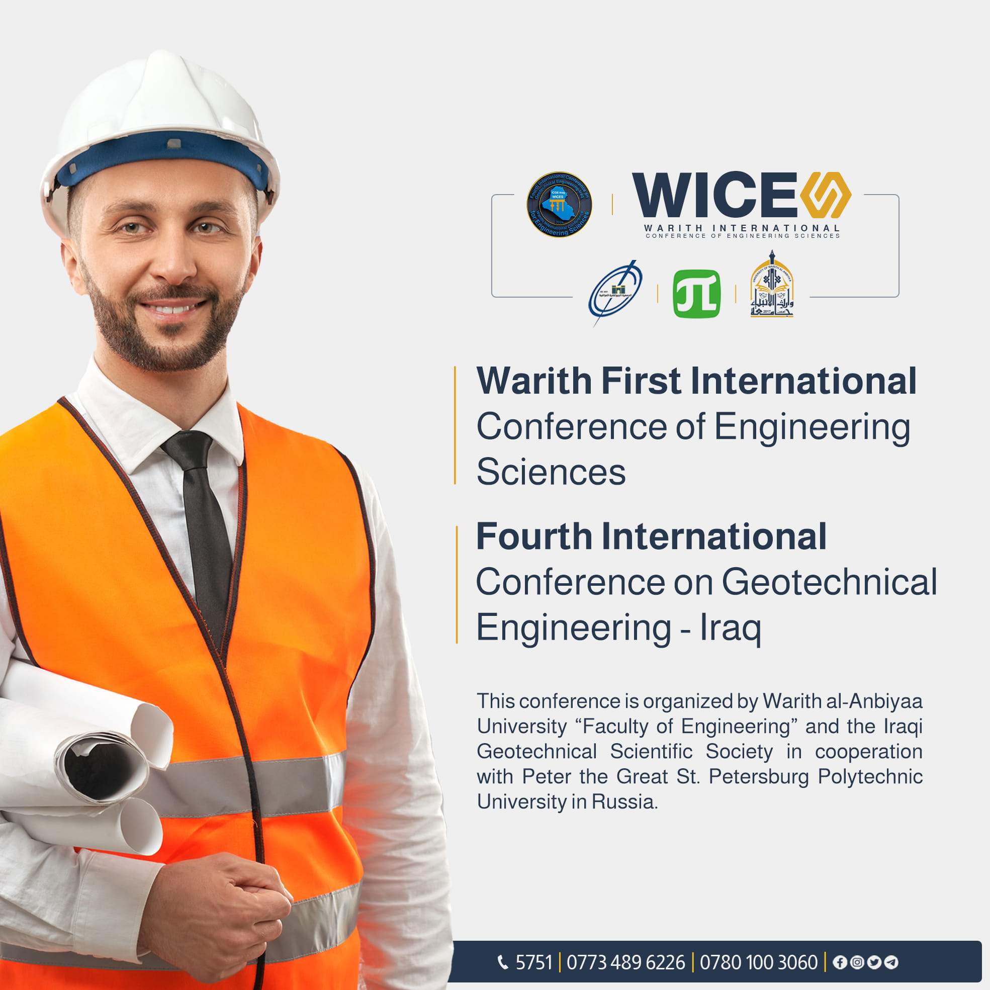 The College of Engineering at the University of Warith Al-Anbiyaa invites academics, researchers from universities and research centers, and local and international scientific associations to participate in the "First International Engineering Sciences Conference." The conference is organized in collaboration with the Iraqi Geotechnical Scientific Association and Saint Petersburg Polytechnic University in Russia.