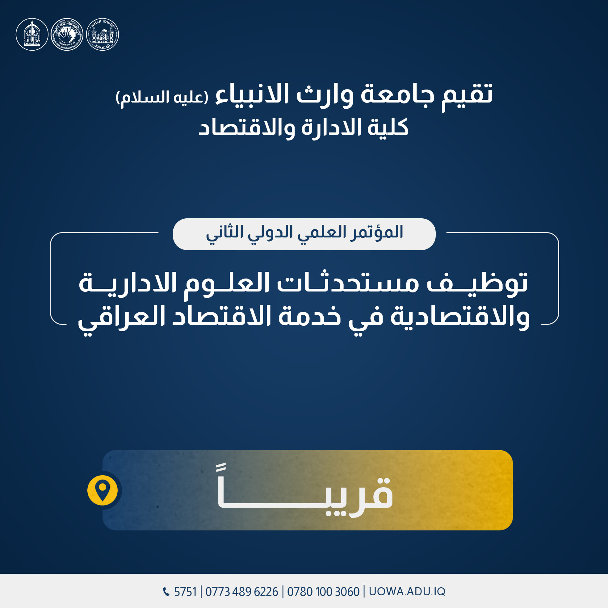 For inquiries and communication: Location: Karbala on Baghdad-Karbala Road, Al-Ala Building/Third Floor - University of Warith Al-Anbiyaa. Contact: