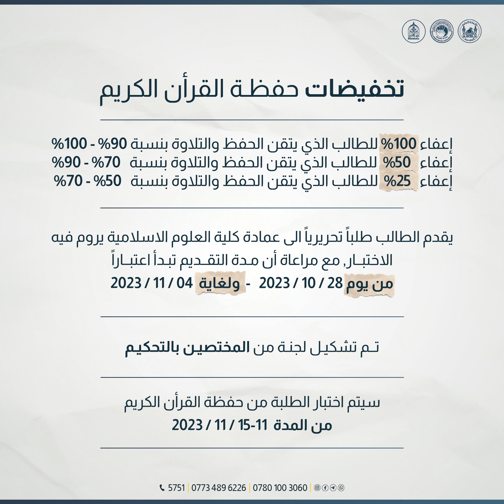 with the support of the Holy Shrine of Imam Hussain, offers a special range of discounts for Quran memorizers across all its scientific and humanitarian colleges and departments.
