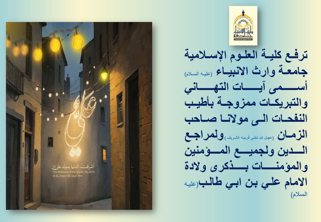 . The College of Islamic Sciences, the University of the Inheritor of the Prophets (peace be upon him) extends the highest verses of congratulations and felicitations mixed with the best breezes to our Master, the Master of the Age (may Allah hasten his honorable reappearance) and to the religious authorities and to all believers, men and women, on the birth anniversary of Imam Ali bin Abi Talib (peace be upon him).
