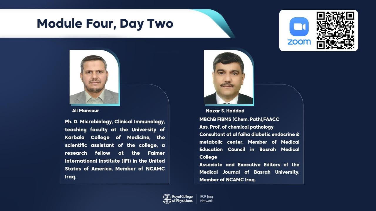 Prof. Dr. Ali Mansour Jassim, Associate Dean for Administrative Affairs at the Faculty of Medicine, Warith Al-Anbiya University, PBUH, will participate as a lecturer in the medical education course held by the British Royal College of Internal Physicians. Iraq branchThe date of the lecture is Friday, August 10, at 8 pm on the Zoom platform.Lecture title: How to be a professional student