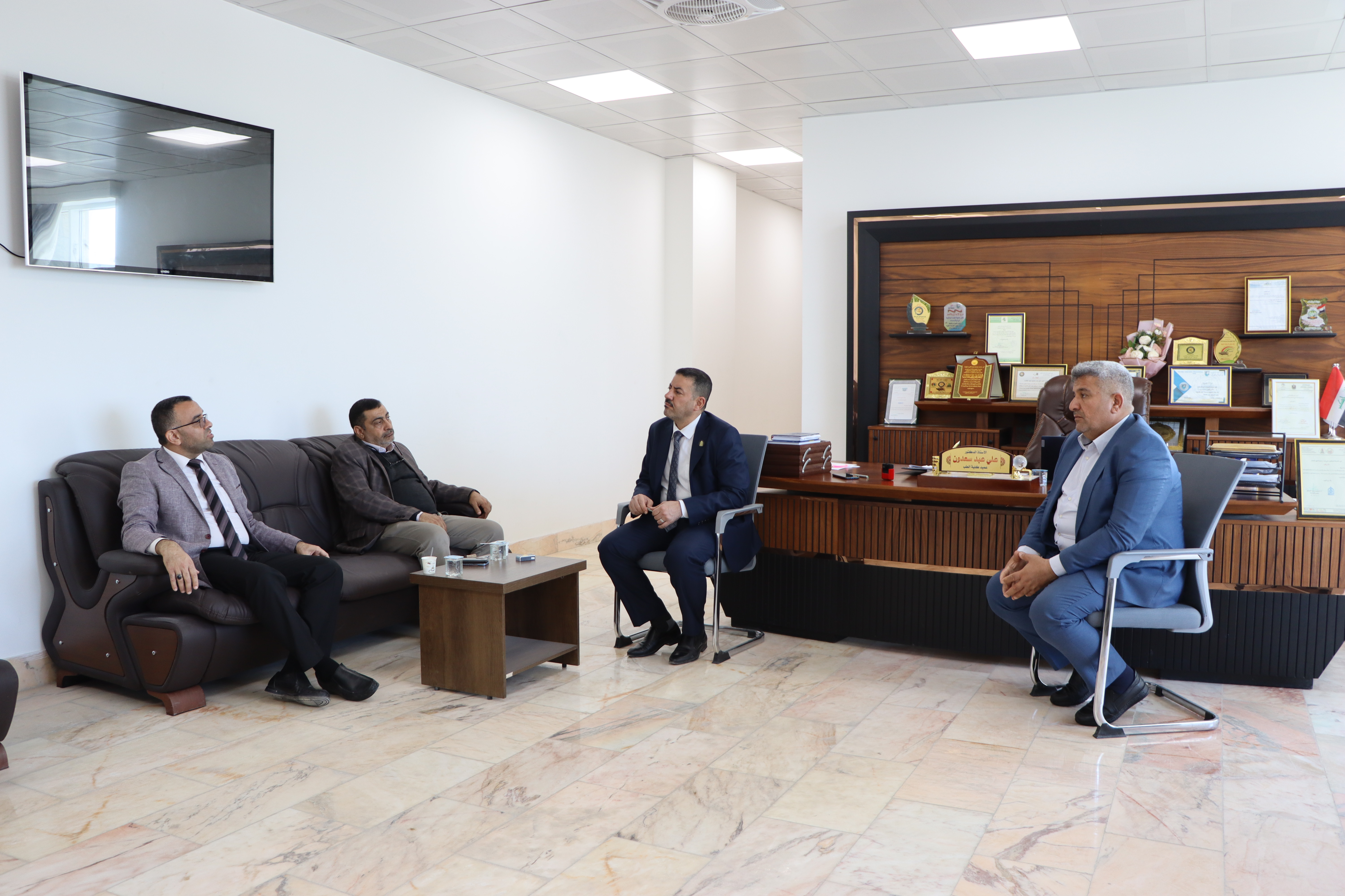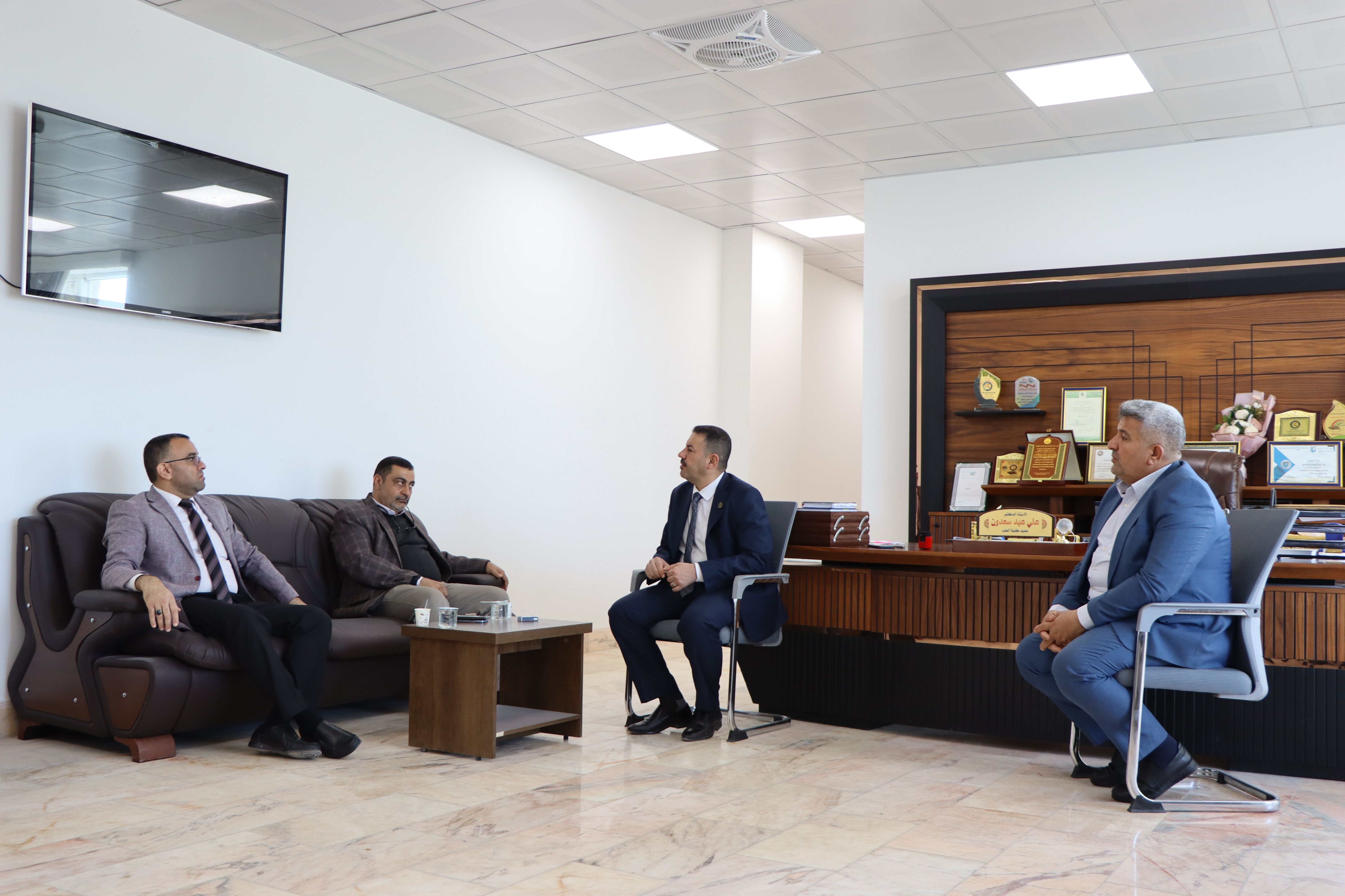The respected Dean of the College of Medicine, Professor Dr. Ali Abd Saadoun Al-Ghazi, and the Honorable Assistant Dean, Professor Dr. Ali Mansour, met with the committee of evaluation experts from the College of Medicine, University of Karbala, headed by the Dean of the College of Medicine, the respected Professor Dr. Riyad Dhihud, and the respected members of the committee.