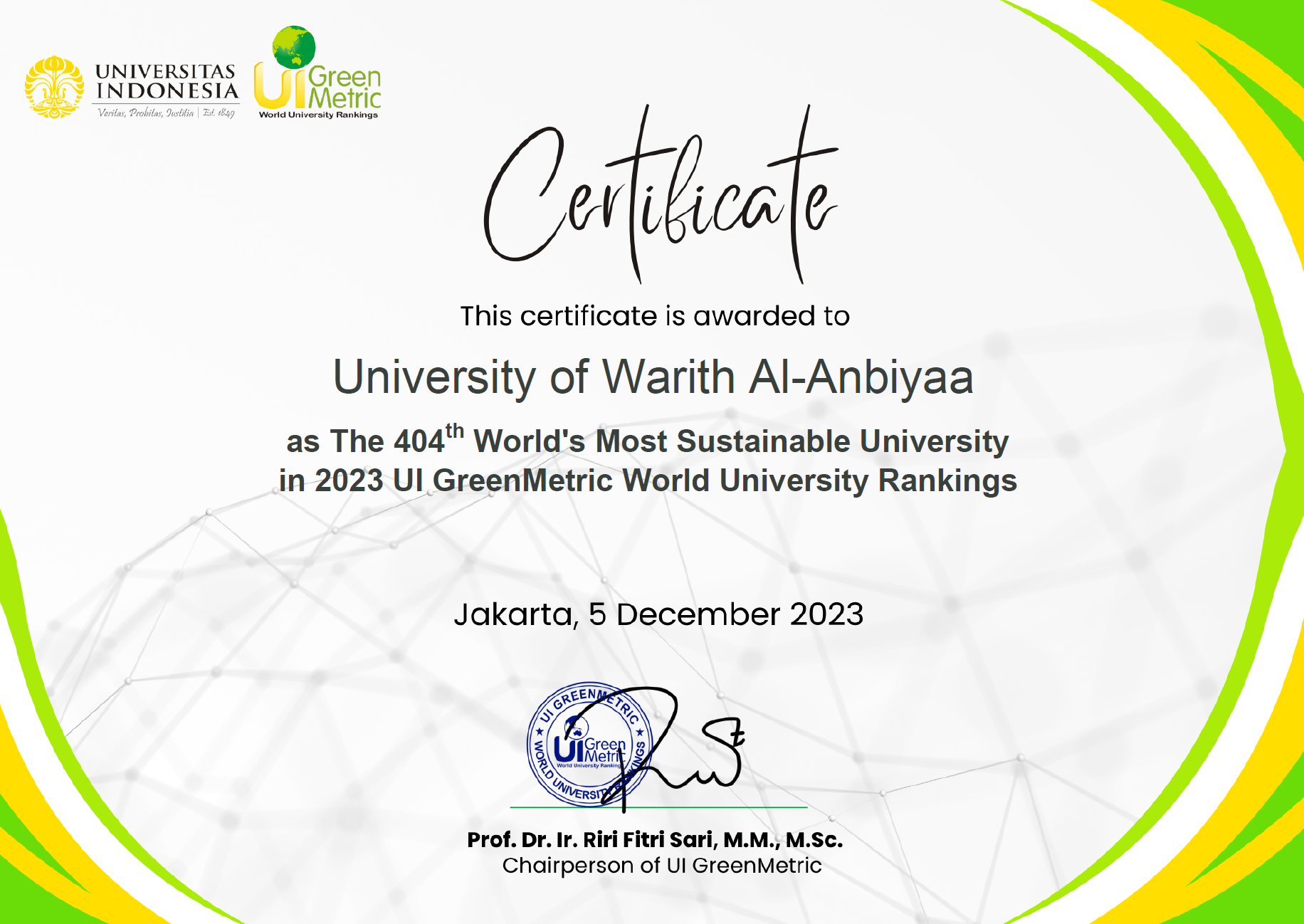Furthermore, the university actively participates in the UI Green Metric, an independent initiative that assesses the sustainability practices of universities worldwide. This participation allows Warith Al-Anbiyaa to systematically measure its compliance with the SDGs, ensuring that its policies and practices align with international benchmarks for sustainability and environmental responsibility.