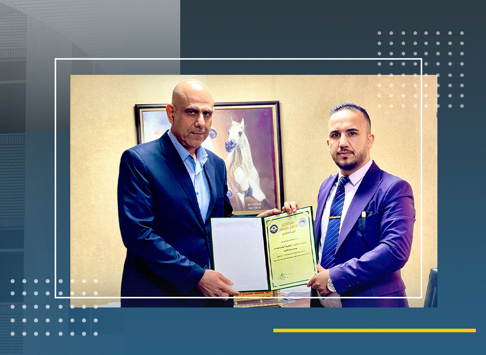 Accepting the certificate of appreciation on behalf of the College of Engineering was Assistant Lecturer Hussein Al-Ghanami, Head of the Quality Assurance Department.