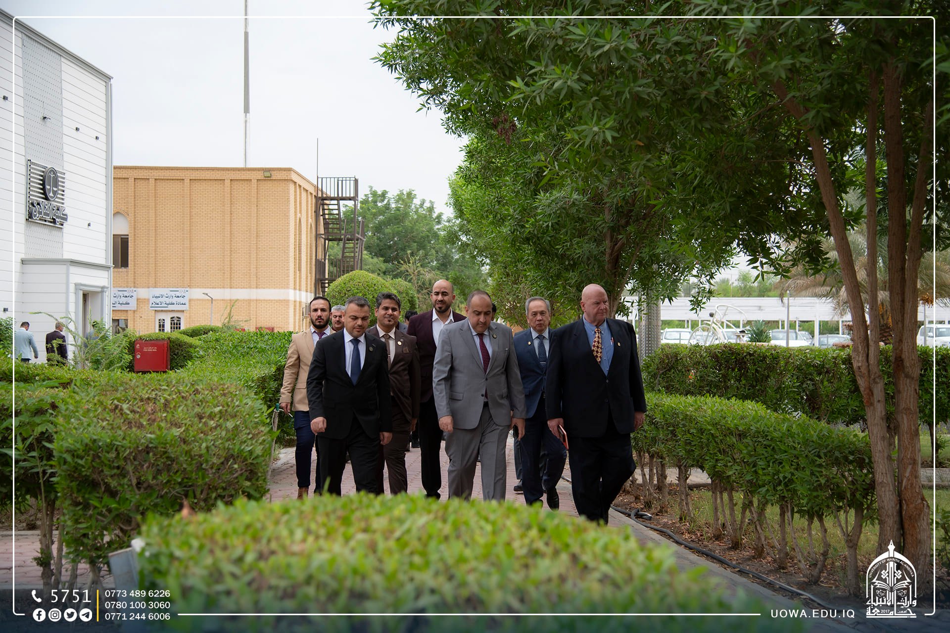 In execution of the terms of the scientific agreement between University of Warith Al-Anbiyaa and the Technological University, Professor Dr. Ibrahim Al-Hayawi, the President of the University, received a delegation from the Presidency of the Technological University, led by Professor Dr. Ahmed Al-Ghaban, the University President. This visit was aimed at enhancing the scientific collaboration between the two universities and monitoring the implementation of the agreement's provisions