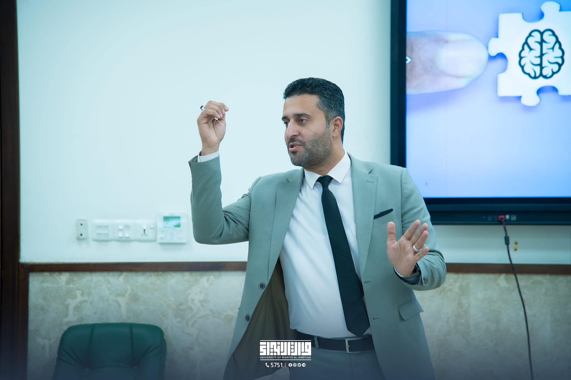 In the presence of Mr. Ibrahim Al-Hayawi, the University President, and Dr. Mohamed Jamal Al-Taif, the Dean of the College of Media, the Department of Digital Media at the College of Media, in collaboration with the Media Department at the Holy Hussainiya Shrine, organized a scientific workshop titled "Digital Design Using Artificial Intelligence Techniques" presented by designer Osama Adnan Al-Khayyat from the Media Office of the Holy Hussainiya Shrine.